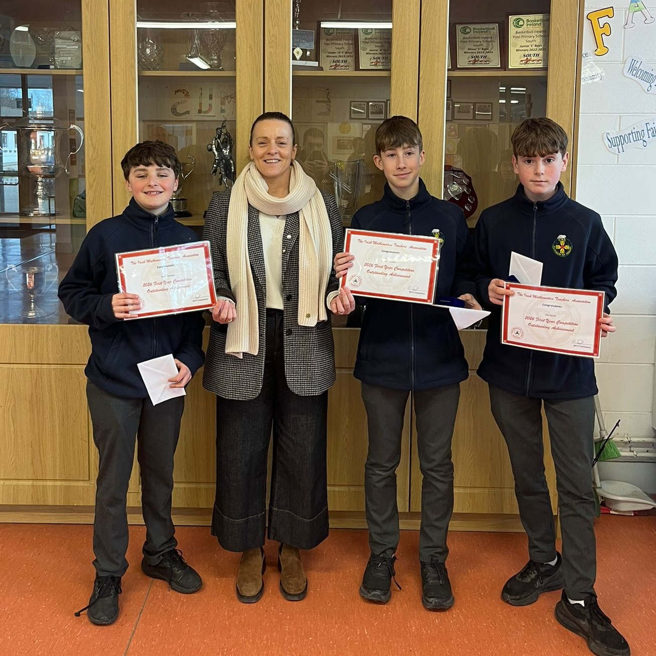 Congratulations to Michael Creedon, Oran Byrne, and Sean Hanrahan, who achieved the highest scores in Midleton CBS in this year’s Irish Maths Teachers Association (IMTA) First Year Competition. In recognition of their excellent performances, they received awards from the IMTA. The lads are pictured with their Maths teacher Ms. Murray and Principal Mr. Ahern and Deputy Ms. Groome.